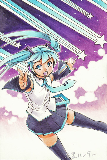 もう1枚いくぜ! ちょっとマイナーへ流れてハローグッバイ。 ボカロ動画は再生数低くても好みだったりするので、 漁るのが大変です。 この曲は耳コピしました。バラードは歌うの楽しい。 リメイクされましたが旧版の方が好みです。 さらにまったく同名のミク曲がありまして、そちらもお勧め。 絵の方は90年代を彷彿とさせるような塗りになりました。 昔は美少女系だってコピックで塗ってたんだぜ。 そういえば先日GLAYのチケット争奪戦に参加しました。 もち負けました。 まあ福岡初日だしな…。 取れたら取れたで学祭真っ最中だったので、まあ良いか、って感じです。 Pillowsは行きたいなぁ…。 あとスピッツのライブDVDが欲しいですが金がありません。 明日から学校ですね。華麗にスルーしたい気分です。 それ以前に今晩中にレポートを書かなくてはいけません。 学祭の前に冬休み来ないかしら。 40㍍Pは同じくらい好きな曲がたくさんあって、 散々に悩んだ挙句、流星ハンター。 他にも「Melody in the sky」と「巨大少女」はぜひ。 元気で良い曲ですよね。 アルバムの2番目にある、底抜けに明るいシングル曲、みたいな。 構図は基本、動画と歌詞を踏まえて決めています。 今回は特にまんまですね。 青系が多くて補正が楽だった。 一日中作業してました。 今日明日は漫画だけに集中できる。至福。 背景用に写真を取りに行くのもだいぶ慣れました。 携帯を買ったけれど、 PCへのデータ移動手段がメールしかないので、使えません。 学祭が終わって一息ついたら、 カードとかそのへんキチンと揃えよう。 |